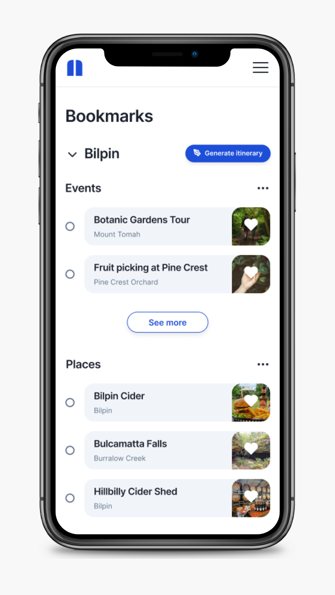 Users can generate their itinerary and populate it with selected events and destinations for a quick and tailored travel plan