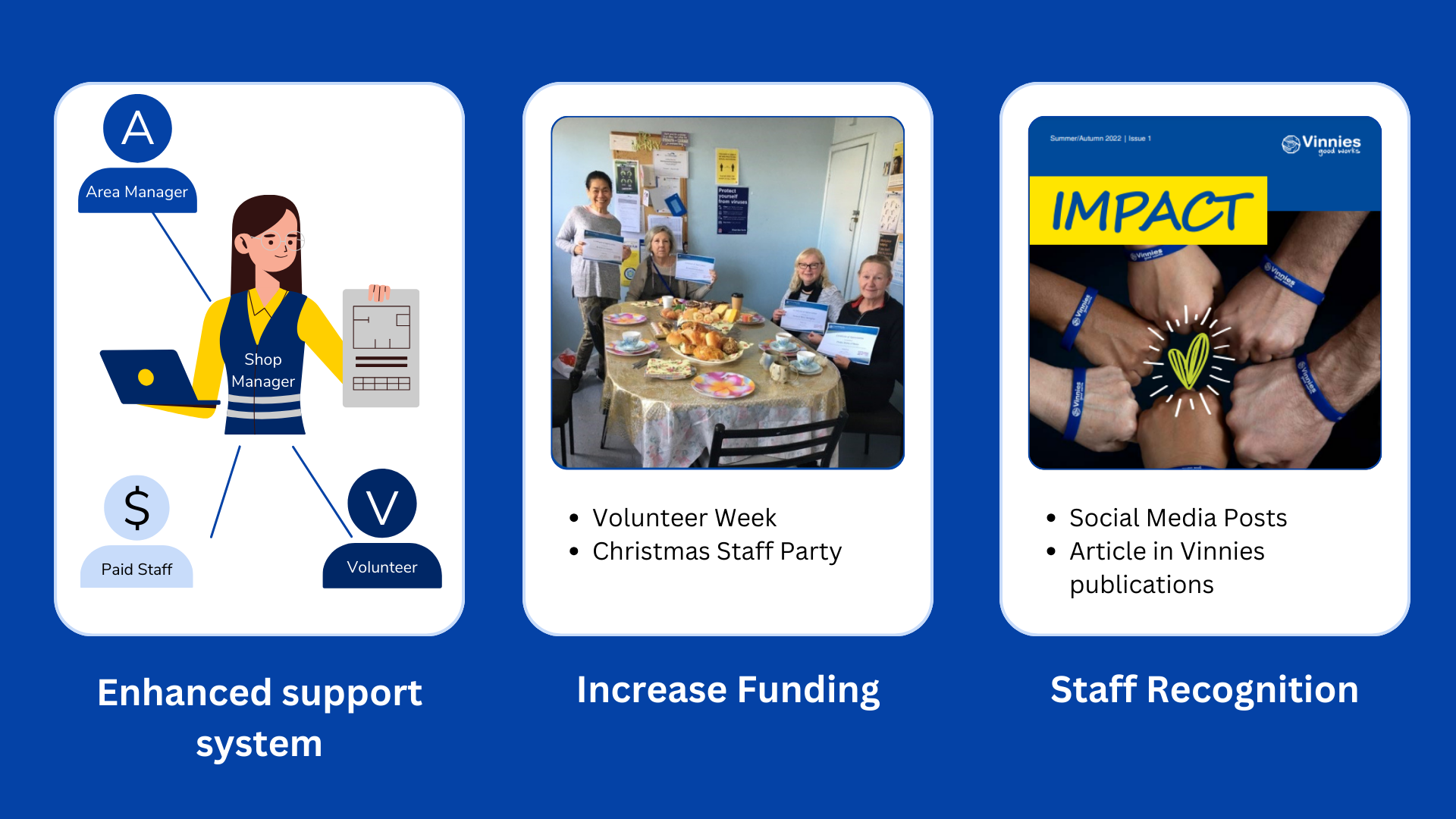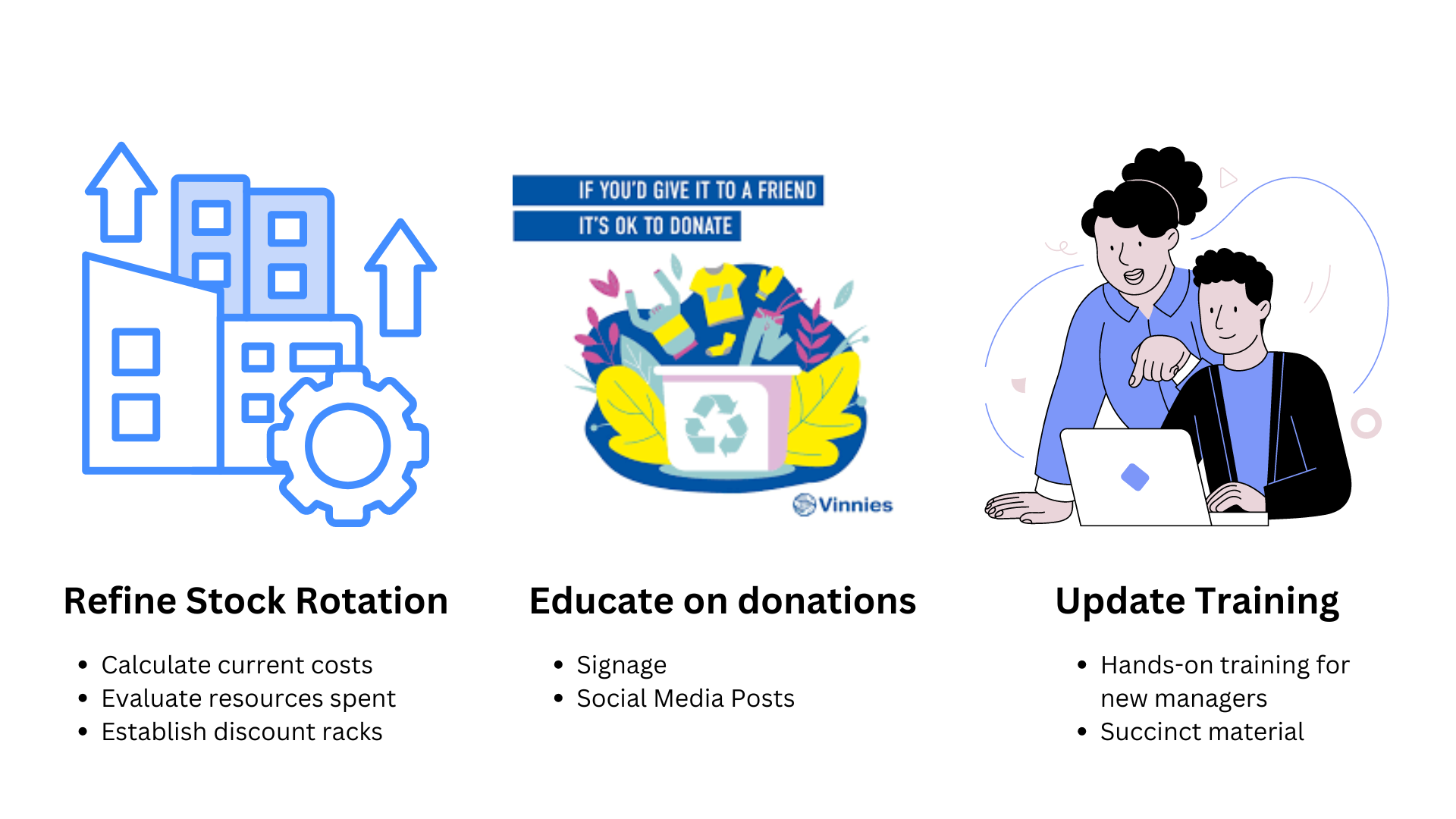 Interviews reveal areas for enhancing Vinnies' procedures to improve efficiency. Stock rotation needs review, factoring in fuel price hikes, inflation, and staffing constraints.