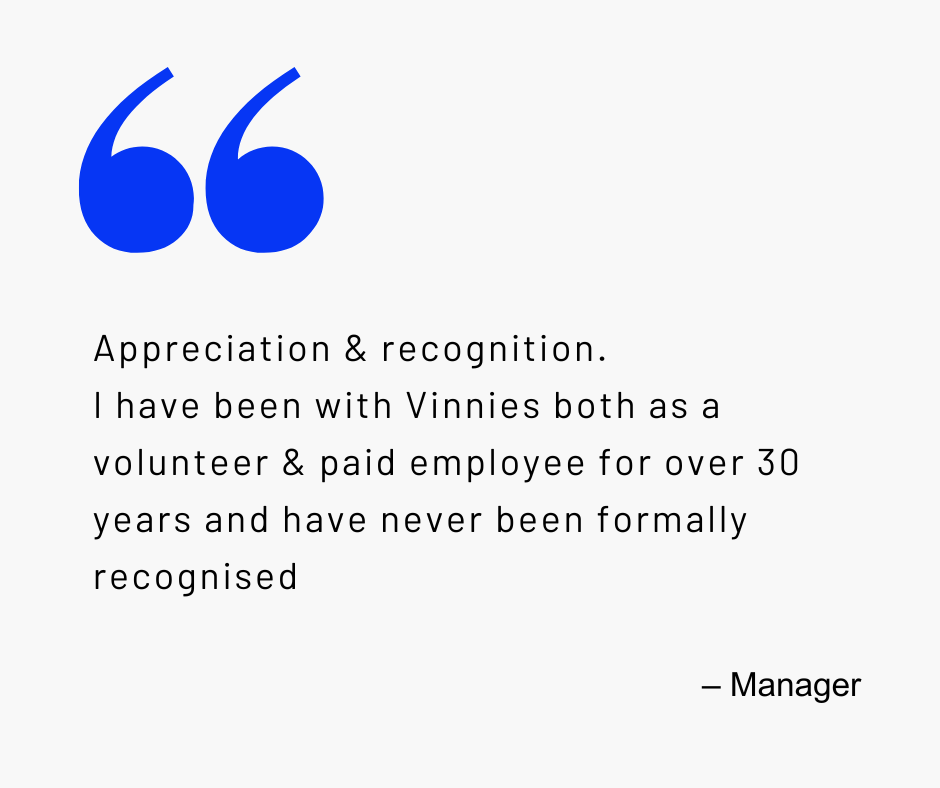 Managers lack formal recognition and appreciation for their efforts, and they believe volunteers are also not adequately acknowledged.